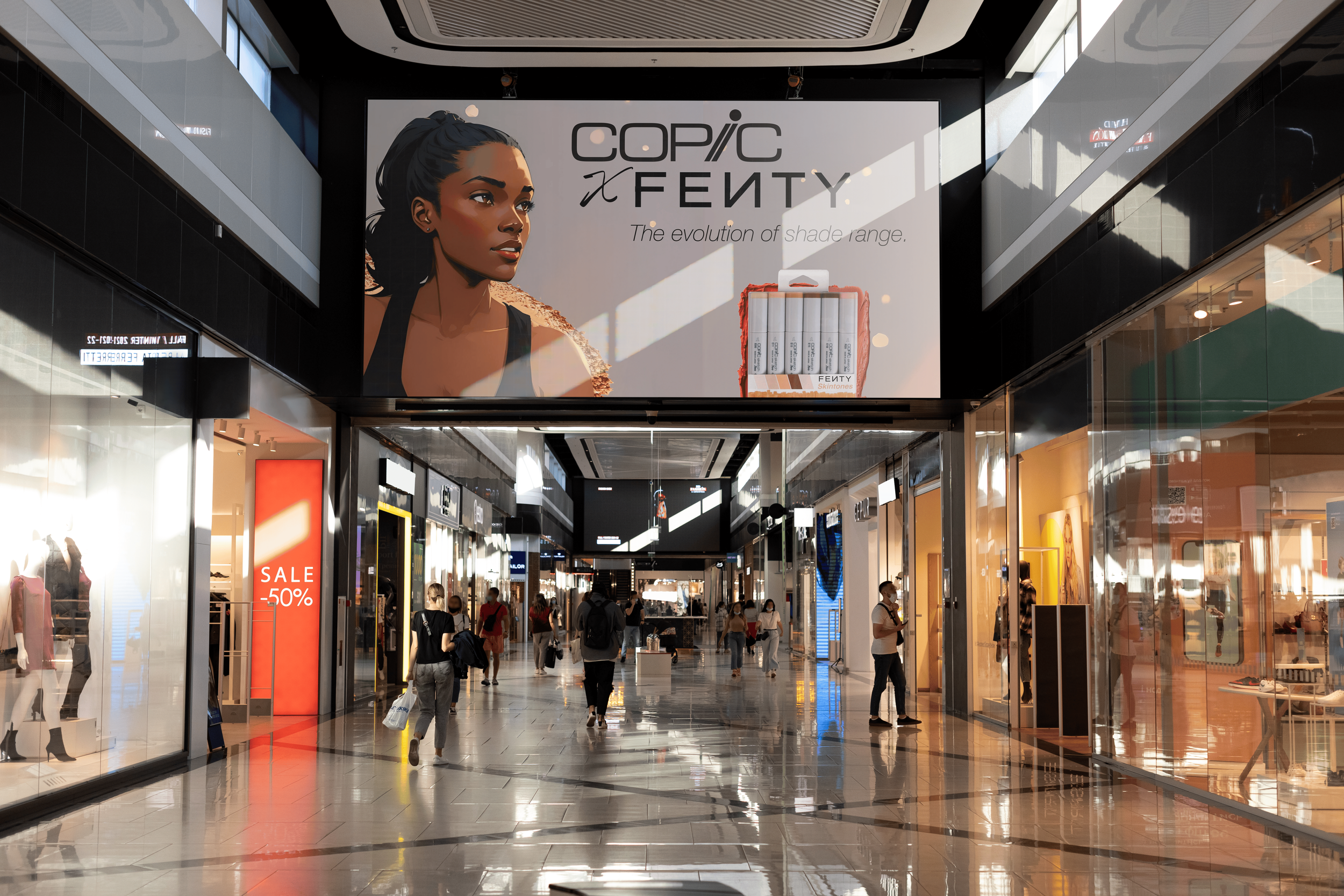 The OOH utilizes two different art styles: Fenty-forward advertisements include real models, while Copic-forward ads are illustration based each highlighting the collab even further.